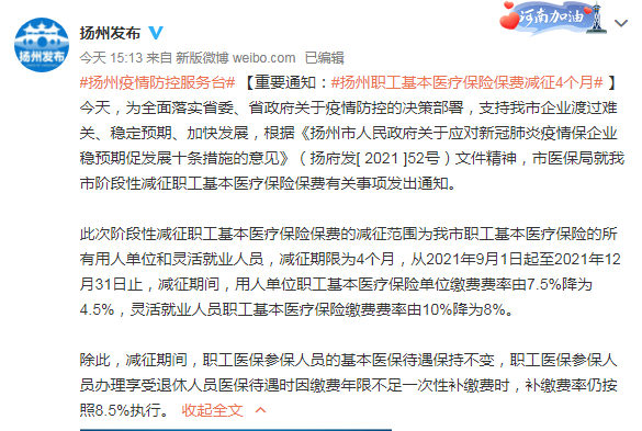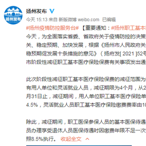 新京报快讯 据@扬州发布微博8月21日消息,为全面落实省委、省政府关于疫情防控的决策部署,支持扬州市企业渡过难关、稳定预期、加快发展,根据《扬州市人民政府关于应对新冠肺炎疫情保企业稳预期促发展十条措施的意见》(扬府发[ 2021 ]52号)文件精神,市医保局就扬州市阶段性减征职工基本医疗保险保费有关事项发出通知。