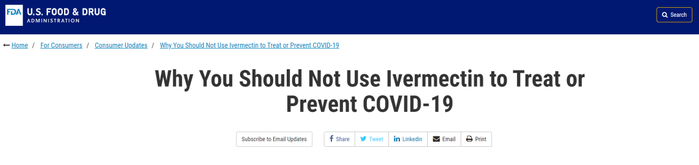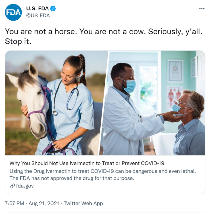 “你不是马,你也不是牛,说真的,你们应该停止(服用伊维菌素)。”FDA在推特上写道,并附上了此前一篇关于“伊维菌素不能治疗新冠”的说明文章。其中指出,FDA收到了多份报告称,有患者在服用了用于马的伊维菌素后急需医疗救助,随后住院治疗。