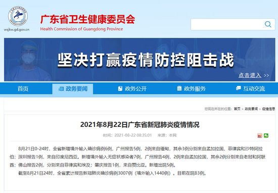 截至8月21日24时,广东省累计报告新冠肺炎确诊病例3007例(境外输入1440例)。目前在院83例。