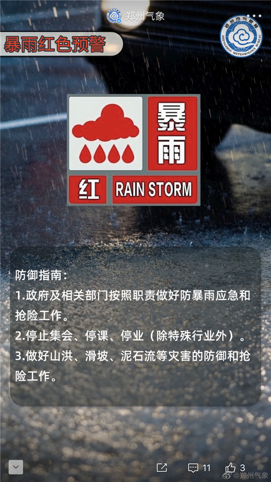 他又翻到相关信息,21日12点,郑州市防汛抗旱指挥部已启动防汛Ⅱ级应急响应,要求采取停工、停业、停学、停运、停课、停产等措施,提醒市民强降雨期间不要外出。