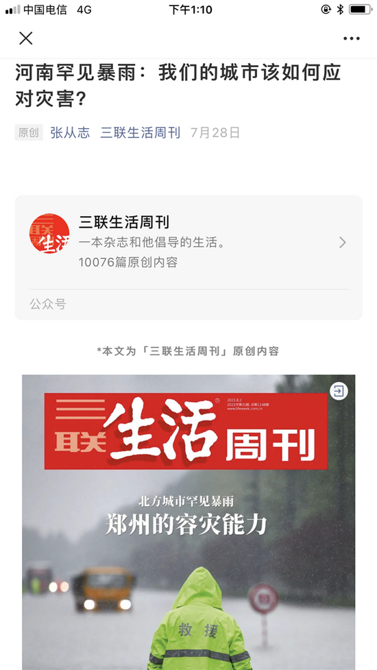 7月28日的《三联生活周刊》曾推出《河南罕见暴雨:我们的城市该如何应对灾害?》报道,其中有这样一段话:
