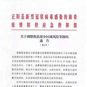 河南省驻马店市正阳县委宣传部今日(8月23日)发布关于调整正阳县部分区域风险等级的通告: