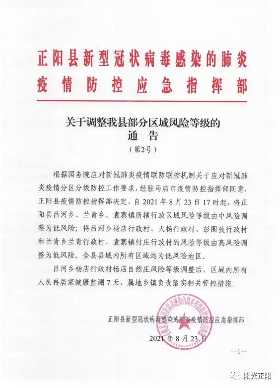自2021年8月23日17时起,将正阳县吕河乡、兰青乡、袁寨镇所辖行政区域风险等级由中风险调整为低风险;将吕河乡杨店行政村、大杨行政村、彭围孜行政村和兰青乡兰青行政村、袁寨镇付庄行政村的风险等级由高风险调整为低风险。全县县域内所有区域均为低风险地区。