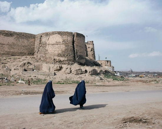2019年,喀布尔南部一处废弃的古堡和两个身披布尔卡的女性。