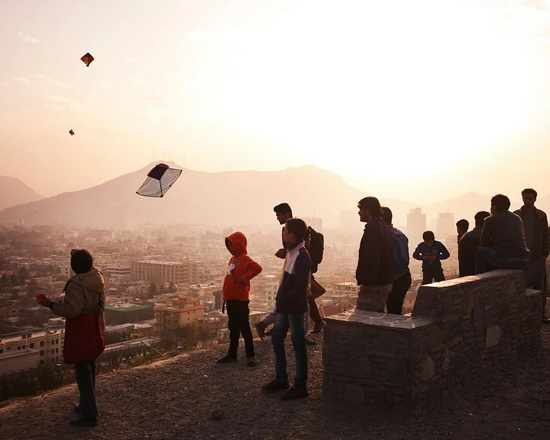 2016年,傍晚时喀布尔国旗山上放风筝的人们。