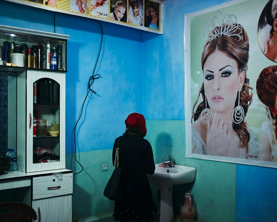 女孩们带我走入她们房屋街区附近的一座美容院。在阿富汗,美容院是男性禁地,这也是女孩们进入之后可以摘下头巾的地方。当她们和美容院老板说明来意之后,作为外国男性的我竟然也跟着进去了,房间内灯光的颜色有些过于刺眼,是偏色严重的蓝色,昏暗且让人眩晕。女孩们在里面自在地化妆,对着镜子尝试各式各样的发饰,从镜子的反射里看得出她们的自信。相比之下,我在里面更为拘束和紧张。