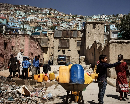 2018年,喀布尔贫民区沿山而建的房屋和打水的孩子们。