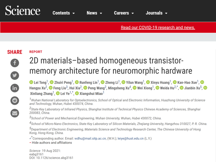 8月19日,《科学》Science在线发表了华中科技大学光电信息学院/武汉光电国家研究中心缪向水、叶镭团队题为“2D materials-based homogeneous transistor-memory architecture for neuromorphic hardware”的研究论文。