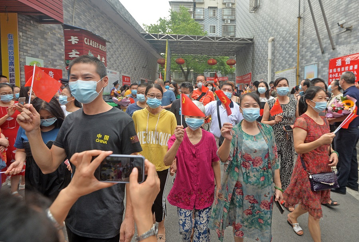 8月13日8时,湖南湘潭市雨湖区杨家湾公安小区,居民在庆祝解封。