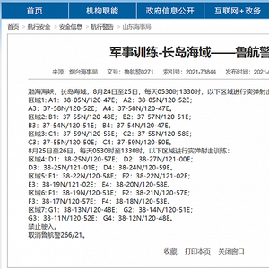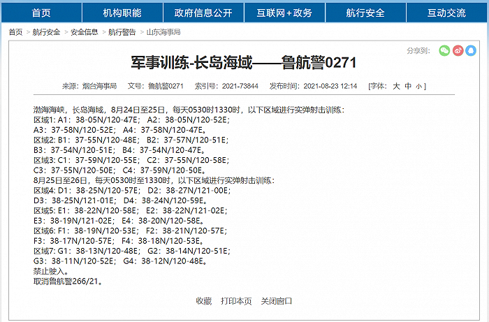 烟台海事局通报,渤海海峡,长岛海域,8月24日至25日,每天0530时1330时三个区域进行实弹射击训练;8月25日至26日,每天0530时至1330时,四个区域进行实弹射击训练。禁止驶入。