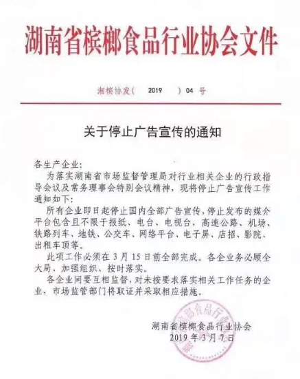 2019年,湖南省槟榔食品行业协会下发了《关于停止广告宣传的通知》,该通知要求所有企业即日起停止报纸、电台、电视台等的全部广告宣传。