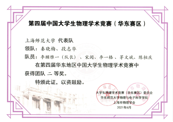 第四届中国大学生物理学术竞赛(CUPT)(华东赛区)比赛在华东师范大学闵行校区举行,共有来自中国科学技术大学、浙江大学、南京大学等38所华东地区六省一市高校的39支代表队参赛。经过激烈角逐,由我校数理学院学生李顾惟一(队长)、宋阅、李一格、茅文斌和陈桓庆组成的代表队荣获团队二等奖。