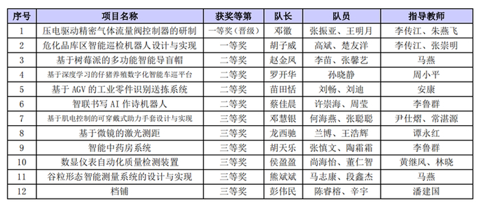 我校共有14支研究生队伍参赛,其中13支队伍参加技术类竞赛、1支队伍参加商业计划书专项赛。参赛同学在指导教师的精心指导下,积极备战、斩获佳绩。其中,李传江、朱燕飞老师指导的邓徽、张振亚、王明月团队“压电驱动精密气体流量阀控制器的研制”和李传江、张崇明老师指导的胡子威、高斌、楚友洋团队“危化品库区智能巡检机器人设计与实现”均获得上海赛区技术竞赛类一等奖,“压电驱动精密气体流量阀控制器的研制”项目晋级全国赛。