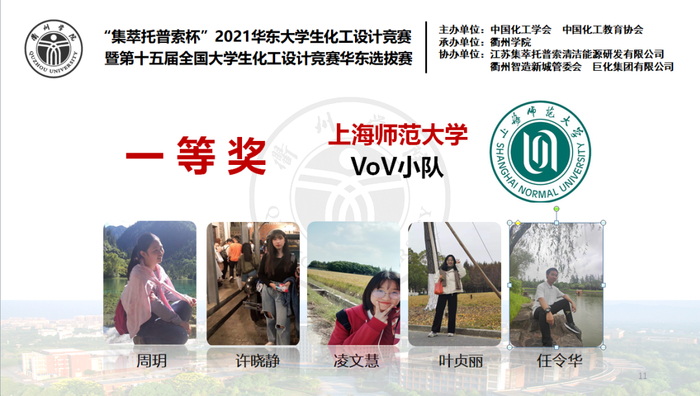 8月2日至6日,“集萃托普索杯”2021华东大学生化工设计竞赛暨第十五届全国大学生化工设计竞赛华东选拔赛顺利举行。由我校周玥、凌文慧、许晓静、叶贞丽、任令华5名同学组成的“VoV小队”斩获华东区一等奖。
