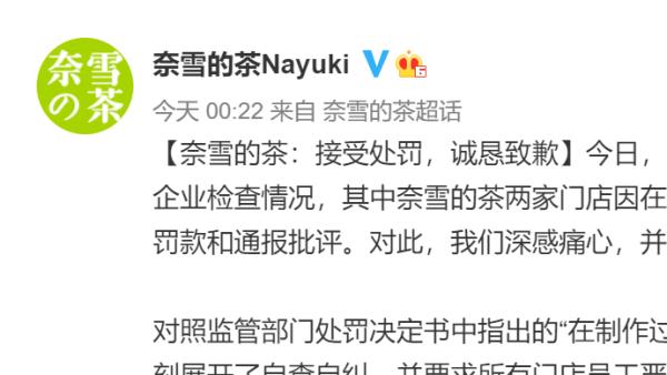奈雪的茶深夜发文回应违规被罚:接受处罚 诚恳致歉