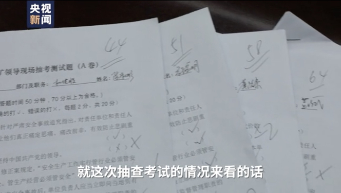 国家矿山安监局监察组成员 刘林林:就这次抽查考试的情况来看,这家矿山企业负责人和安全生产管理人员对一些应知应会的安全知识和安全技能,还是无法达到国家要求的。从试卷目前的结果来看,该矿山企业的日常安全培训是流于形式的。