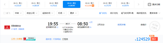 8月24日,红星资本局通过携程进行不完全统计,在未来半个月,中美航线中最高的机票价格出现在9月3日上海-纽约航线上,由中国国航和阿联酋航空承运不同航段,经济舱已售完,仅剩3张机票(公务+头等舱组合),售价约为12.45万元/张。