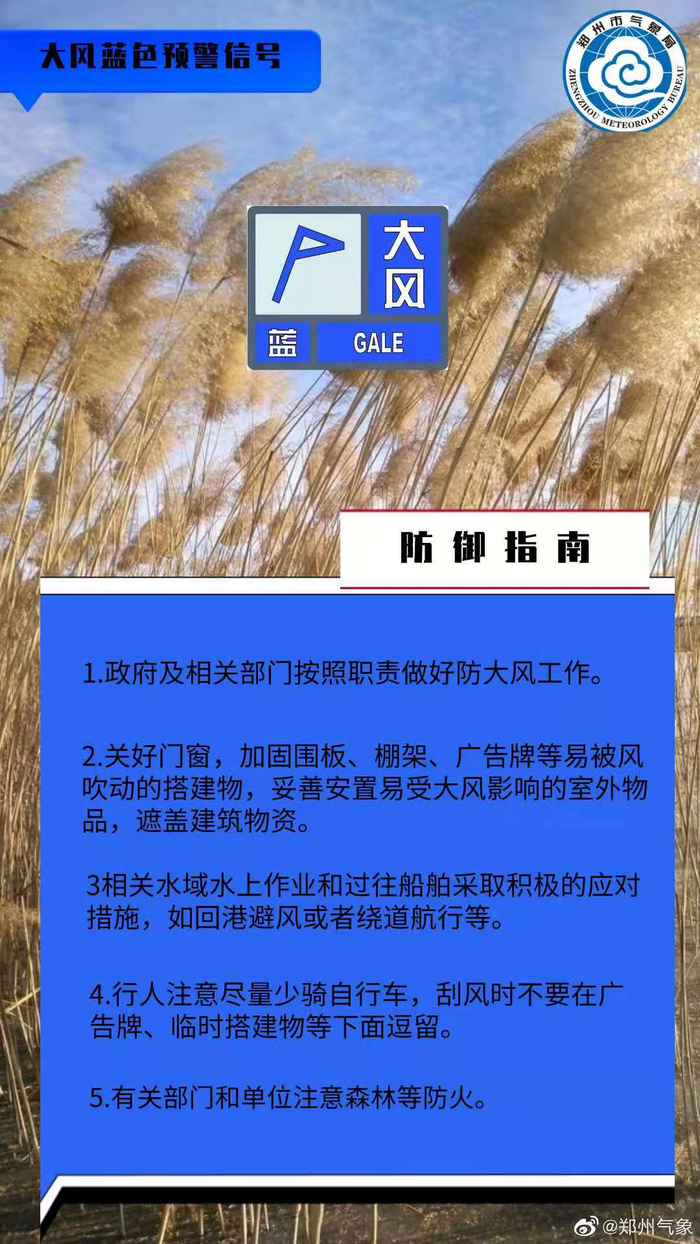 注意!郑州发布大风蓝色预警:最大风力达6到7级
