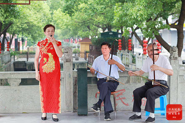 在杭州市的公园里有许多文艺角,傍晚时分喜爱文艺的老人们会相约来到文艺角吹拉弹唱,通过文艺活动怡情养性,乐享晚年幸福生活。图为杭州市临平区运河街道的老年乐队在公园里奏二胡、唱戏曲。(杭州市临平区纪委监委 陈莉 摄)