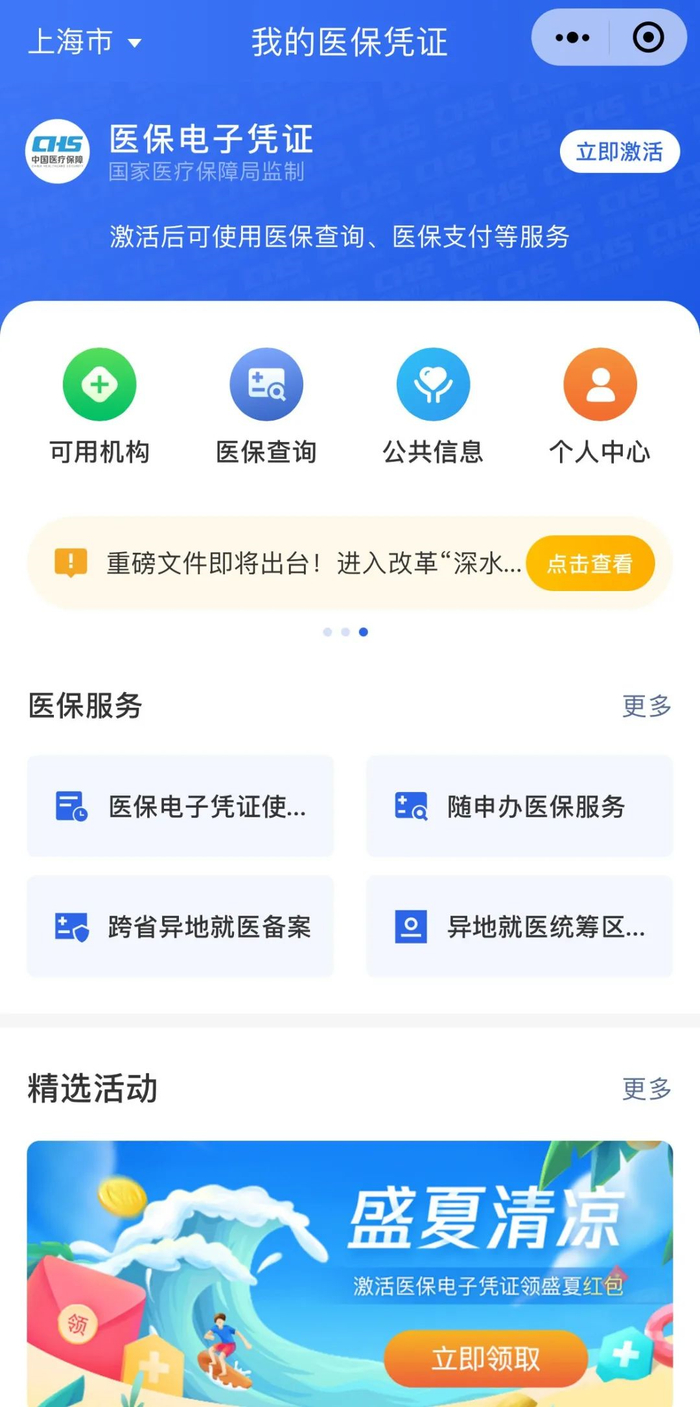 方法二:在微信中搜索小程序“我的医保凭证”,选择“立即激活”,按提示进行操作。
