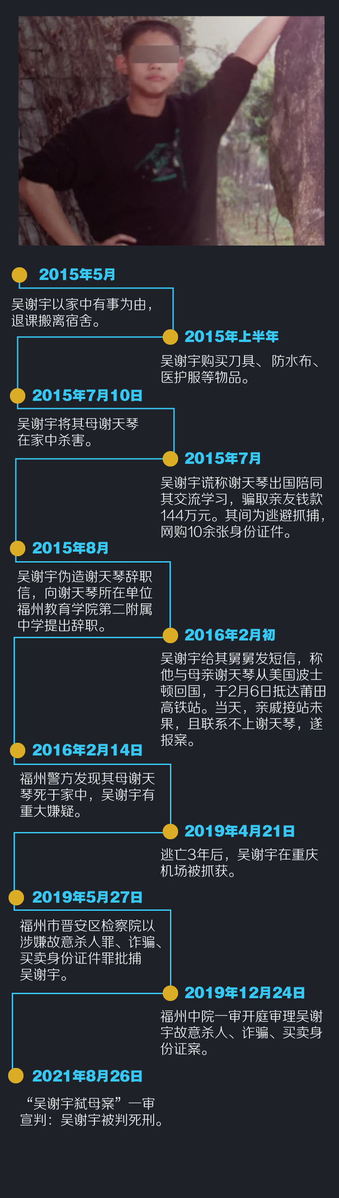 2016214日,教师谢天琴被发现死在福州市晋安区一所中学教职工宿舍的家中。警方侦查发现,谢天琴的儿子吴谢宇有重大作案嫌疑。随后吴谢宇逃亡3年,直到2019421日,吴谢宇在重庆江北机场被警方抓获。2021826日,吴谢宇被判死刑,剥夺政治权利终身,并处罚金人民币十万三千元。