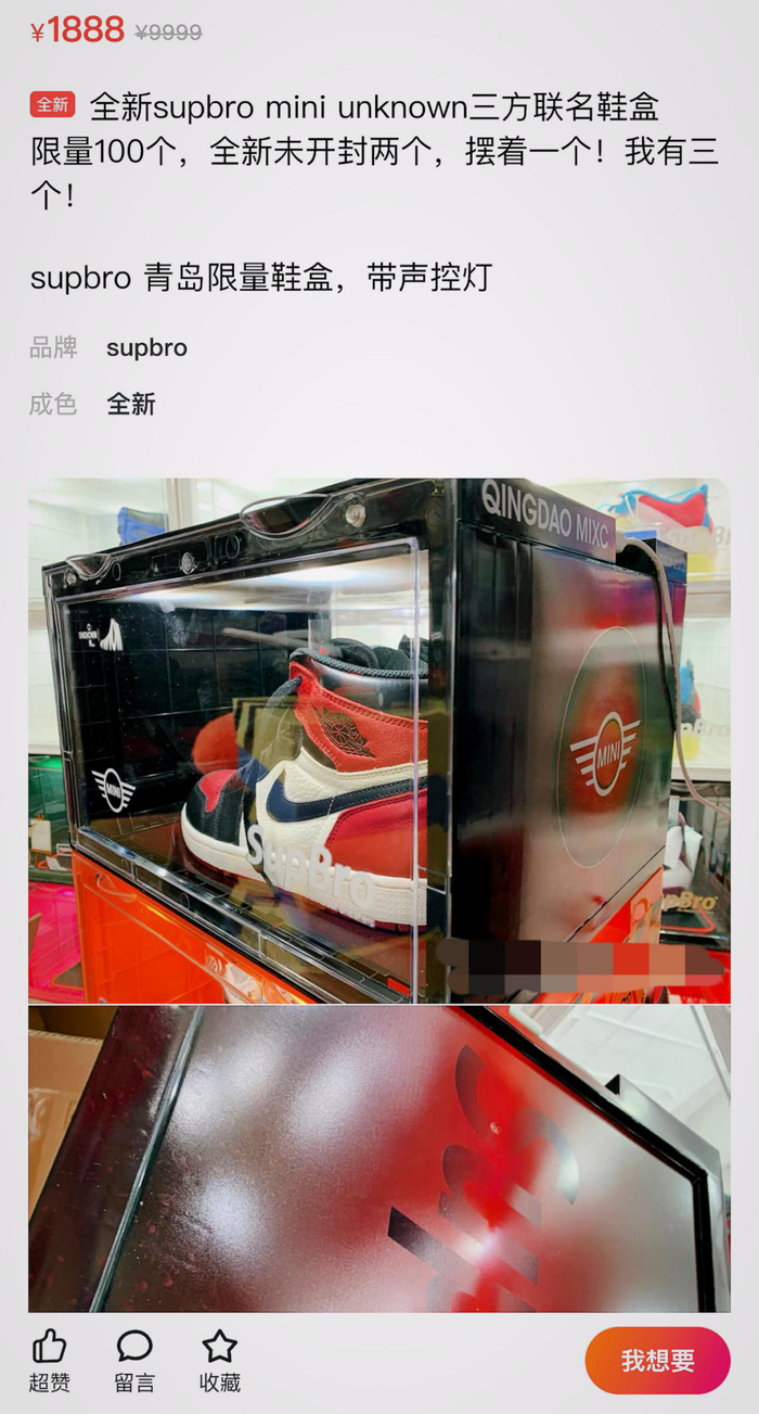 玩家的追捧推动着鞋盒市场的爆发,鞋盒品牌所推出的“限量款”、“联名款”更是得到玩家的青睐,市场上继“炒鞋热”后出现了“炒鞋盒热”。不少抢到货源的玩家除了自己收藏外,还有的是以高于原价数倍的价格转手销售,从中获利。