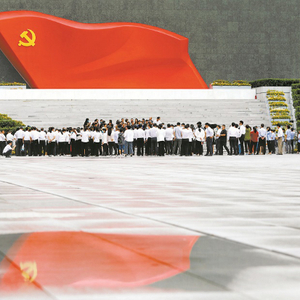 中国共产党历史展览馆西侧广场上的雕塑作品《旗帜》,吸引众多参观者驻足观看。 (图片来源:人民视觉)