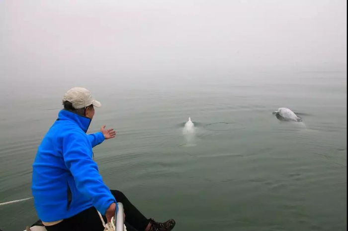 北部湾海面,为拯救珍奇的白海豚潘文石与团队依然不断地进行海上追踪