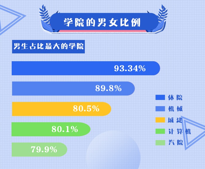 今年,女生比例最高的学院是占比 79.51% 的外国语学院其次是管院、艺院、文法学院