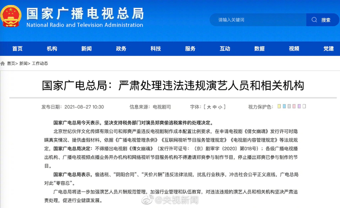 国家广电总局要求停播郑爽已参与制作的节目