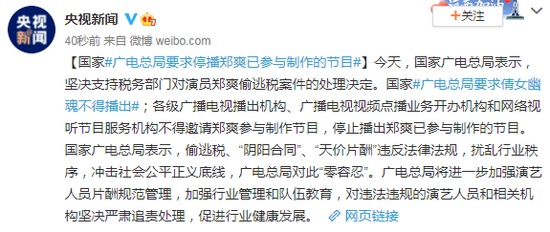 原标题:国家广电总局要求停播郑爽已参与制作的节目