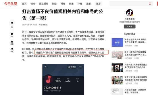 8月24日晚间,抖音安全中心发布打击宣扬不良价值观相关内容和账号的公告(第一期)。8月以来,抖音对1976条宣扬不良价值观的视频进行不推荐处罚,对7个账号进行梯度处罚。其中,抖音用户“风小逸” 因长期渲染卖惨和宣扬不良风气、诱导未成年人打赏,造成不良社会影响。根据相关规则,抖音安全中心已永久封禁用户“风小逸”账号。