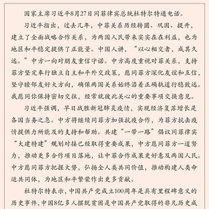 杜特尔特表示,中国共产党成立100周年是具有里程碑意义的历史事件,中国8亿多人摆脱贫困是中国共产党取得的非凡历史成就,我再次表示热烈祝贺。过去5年里,菲中开启了全面战略合作关系的新时代。面对新冠肺炎疫情,菲中友谊经受住考验,双边经济合作逆势上扬,很好诠释了“患难见真情”。菲方赞赏中方为引领全球团结抗疫作出的贡献,感谢中方为菲方提供疫苗等帮助,希望同中方继续加强抗疫合作。菲方欢迎中方更多投资菲规划建设项目,希望两国基础设施、农业等领域务实合作取得更多成果。菲方珍视同中方的友谊,不会在地缘政治中做伤害中方利益的事情,愿积极推动东盟同中国关系持续发展。