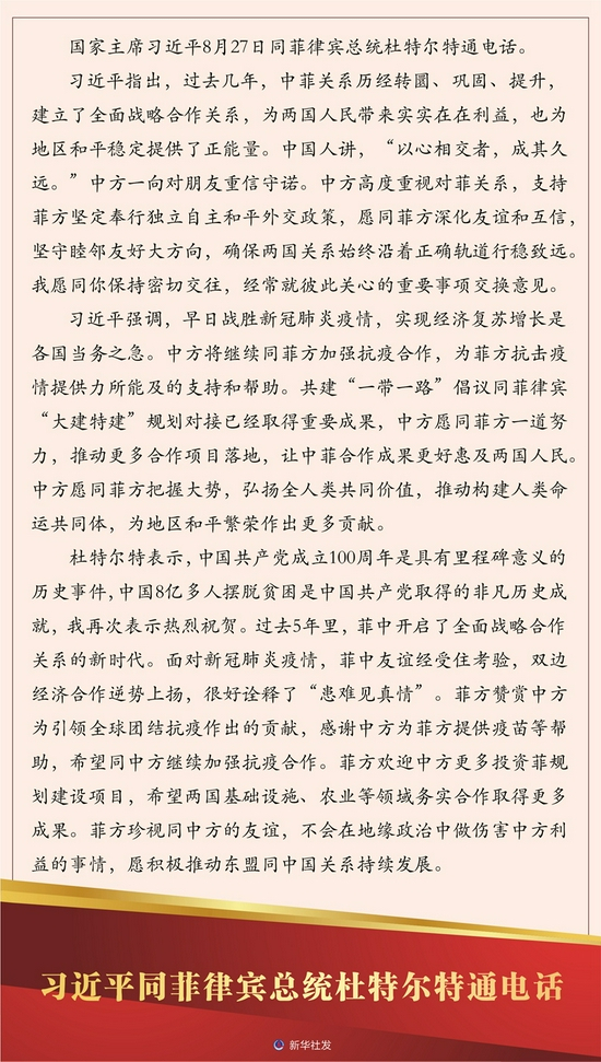 新华社北京8月27日电 国家主席习近平8月27日同菲律宾总统杜特尔特通电话。