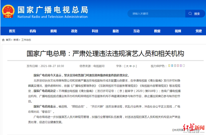 8月27日,国家广电总局发文称,严肃处理违法违规演艺人员和相关机构,偷逃税、“阴阳合同”、“天价片酬”违反法律法规,扰乱行业秩序,冲击社会公平正义底线,广电总局对此“零容忍”。