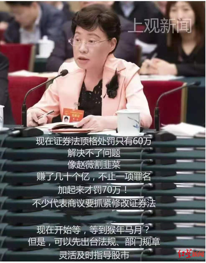 就此事件,在2019年3月的全国“两会”期间,上海代表团全体会议上,全国人大代表樊芸指出,“现在证券法顶格处罚只有60万元,解决不了问题。像赵薇割韭菜赚了几十个亿,不止一项罪名,加起来才罚70万元!”