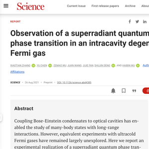 美国时间8月26日,国际物理学权威学术期刊《科学》(Science)杂志以“First Release”形式刊发华东师范大学精密光谱科学与技术国家重点实验室武海斌教授课题组的研究成果“光学腔内超冷简并费米气体超辐射量子相变的观测”。这是2016年发表《标度不变的费米气体中Efimovian膨胀的观察》后,武海斌团队成果以华东师范大学为第一完成单位再登《科学》正刊。