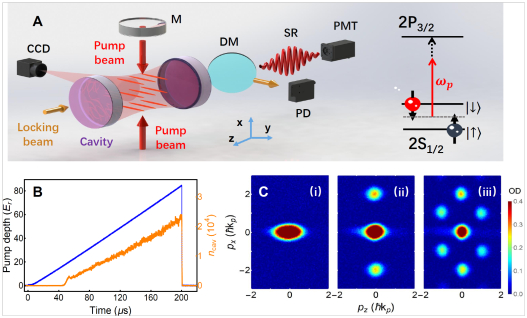 实验设计如图1A所示,一个频率小于费米原子共振频率的激光在横向泵浦光学腔内的超冷费米原子,当泵浦功率低于一个临界值(阈值)时,在光学腔的输出观察不到透射的光,费米原子展现了其在浅光学晶格中的费米气体动量分布(图1C中的(i)和(ii));一旦泵浦光功率增加到阈值以上,光学腔内的光场就会突然形成,同时原子密度波动诱发超辐射量子相变,对角线动量分量的原子会突然增加,自发的自组织,形成棋盘格图案的原子密度分布(图1C(iii))。