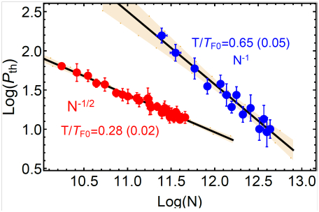 图2:超流量子相变阈值和原子数的标度率。红点和蓝点分别对应于T/TF0=0.28(0.02)和T/TF0=0.65(0.05)的测量数据。括号内表示标准偏差。黑色实线与函数Pth=CN-s的拟合结果,结果低温的标度率为s=0.48(0.02),与理论预测s=1/2相吻合;高温的标度率为s=0.97(0.04),接近N-1。