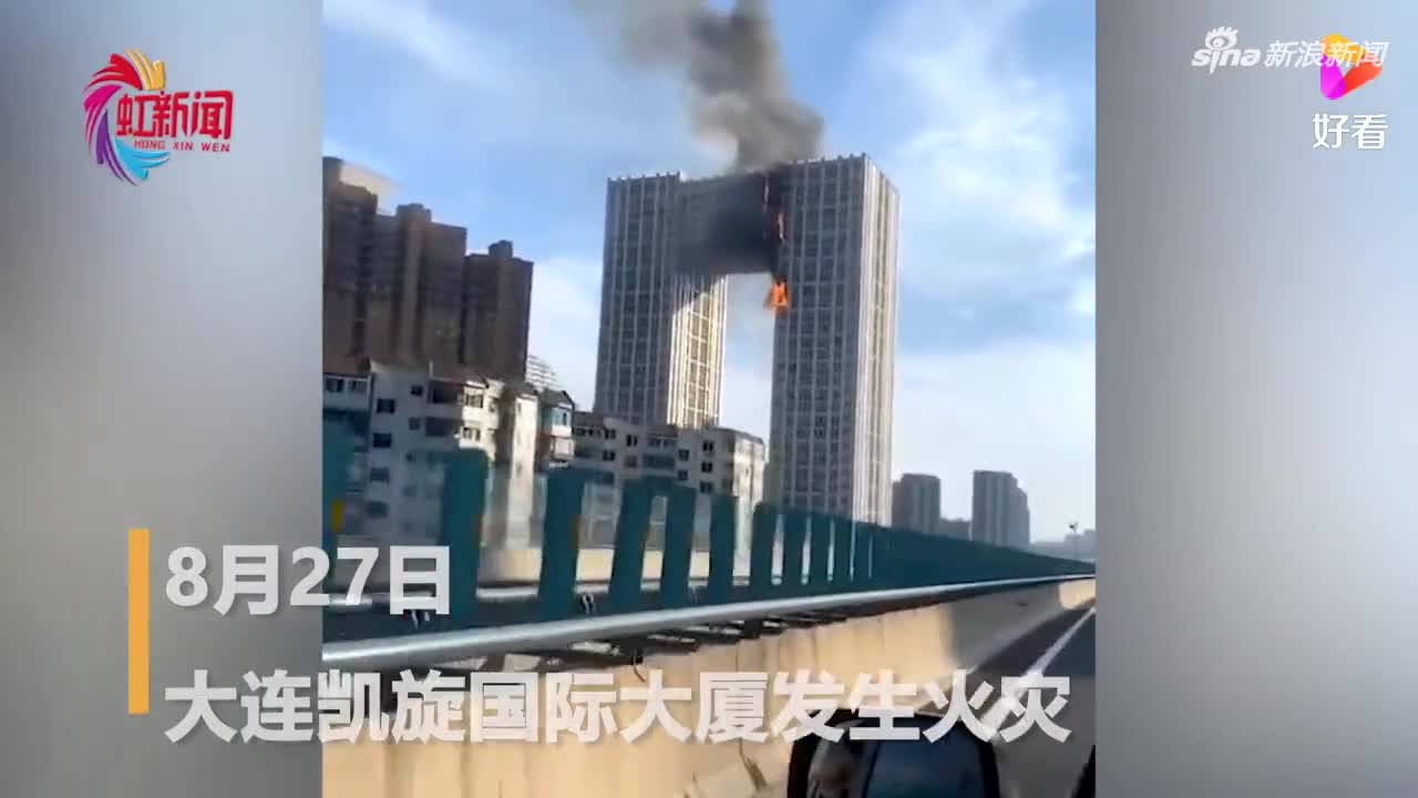 大连凯旋国际大厦火灾:楼面盘旋一条“火龙”,消防员站楼顶灭火
