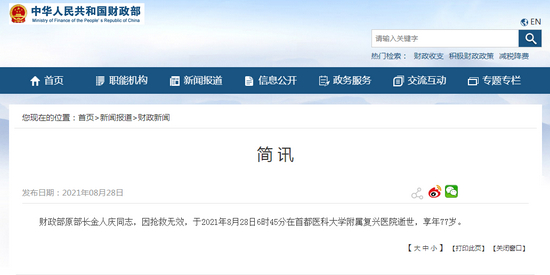 财政部原部长金人庆同志,因抢救无效,于2021年8月28日6时45分在首都医科大学附属复兴医院逝世,享年77岁。