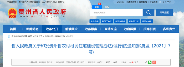 贵州省人民政府网站8月27日消息,贵州省人民政府发布通知,印发《贵州省农村村民住宅建设管理办法(试行)》(下称《管理办法》)。