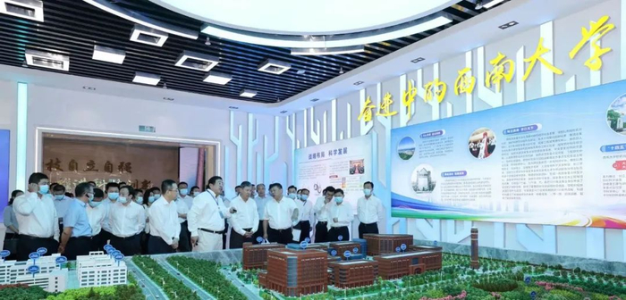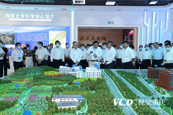 活动中,重庆市政府副市长、西部(重庆)科学城党工委书记、重庆高新区党工委书记熊雪,市政府办公厅副主任凌凡,市政府督查办、市发展改革委、市教委、市科技局、市经济信息委、市财政局、市人力社保局、市规划自然资源局、市生态环境局、市住房城乡建委、市交通局、市卫生健康委、市统计局、市金融监管局、市大数据发展局、市招商投资局有关负责人,西部(重庆)科学城管委会、沙坪坝区、九龙坡区、江津区、壁山区政府主要负责人和有关园区负责人,北碚区委、政府主要负责人及相关分管负责人、有关部门负责人和有关企业代表共计60余人参观了西南大学科学中心规划馆。张卫国对科学中心的建设思路、建设内容、建设目标、建设时序等进行了全面介绍,相关团队专家代表就具体项目建设规划进行了汇报。熊雪对科学中心的战略规划布局和建设思路等作了充分肯定,并希望学校和北碚区加快推进规划项目落地建设,服务国家战略需求和地方经济社会发展。