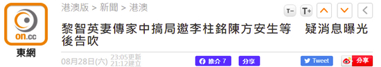 [环球网综合报道 记者赵友平]香港“东网”消息,壹传媒创办人黎智英家中传出28日晚举行家宴、邀请民主党创党主席李柱铭、香港前政务司司长陈方安生等,疑为黎智英涉及的一连串官司急商对策,不过疑因消息曝光而饭局告吹。