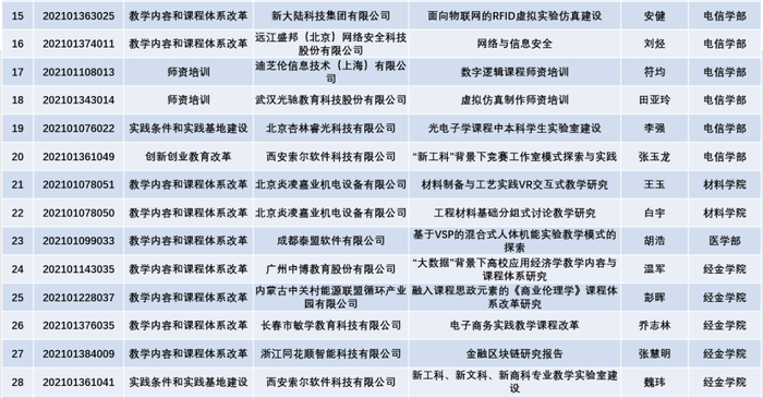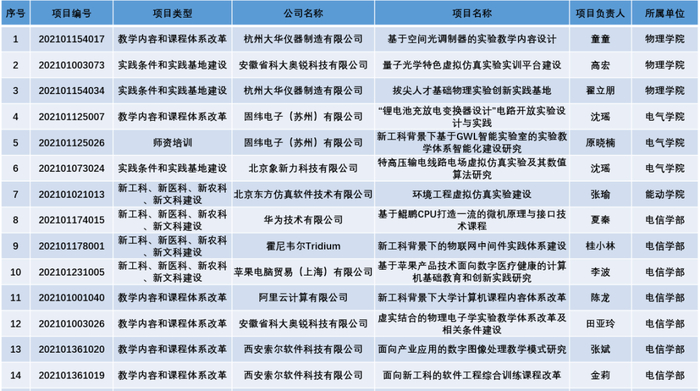 西安交大获批的40个项目获得了华为、阿里云、霍尼韦尔、科大讯飞、山东浪潮铸远、固纬电子等30个国内外知名企业的支持,校企合作致力于新工科建设、教学内容和课程体系改革、创新创业教育改革、师资培训、实践条件和实践基地建设。