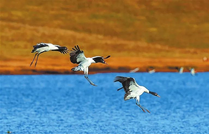 黑颈鹤是国家一级保护动物,主要在青藏高原繁殖,在云贵高原过冬,是世界上15种鹤类中唯一在高原上繁殖和越冬的鹤鸟,属珍稀濒危国家一级重点保护动物,被称为“鸟类熊猫”。