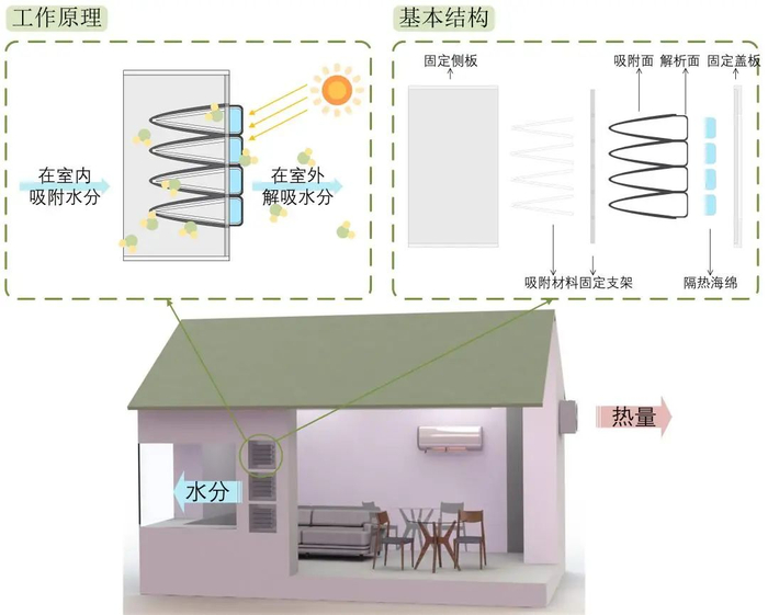 我国南方城市全年湿度较高,高湿环境不仅影响人体舒适感,还会影响空气品质,导致疾病风险的增大。在广泛的除湿需求下,当前主流的湿度控制技术能耗较高,其能耗约占全球每年总能耗中的8%。而本项目所制造的吸附除湿窗完全由太阳能驱动,由高太阳能吸收、低导热和亲水型多孔材料复合吸湿盐溶液制成。通过光热局部加热产生的温度梯度,实现在室外解吸水与室内吸附水,并利用溶液浓度梯度与毛细力将水分定向送至室外,实现连续除湿过程。使用本项目所制造的除湿窗除湿时,不仅能起到湿度控制的作用,还能够在使用家用空调时,承担其能耗中40%的潜热负荷,减少电能耗用的同时对环境无污染物排放,对节能减排具有重要意义。