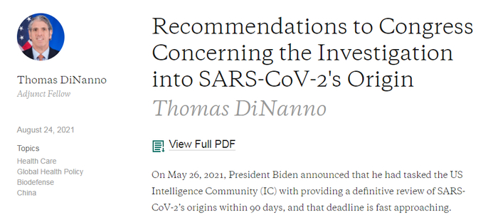 就在8月24日,也就是拜登要求情报部门提交的“新冠病毒起源情报报告”应该交到白宫之前,迪南诺在哈德逊研究所网站发表文章,建议国会关注新冠病毒起源问题。