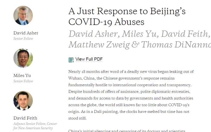事实上,在进入哈德逊研究所后,余茂春和迪南诺等人一直通过发布所谓“研究报告”,意图污蔑中国将新冠病毒当做“工具”,然后给拜登政府施加更大的压力。