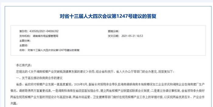 近日,湖南省市场监督管理局网站发布《对省十三届人大四次会议第1247号建议的答复》(以下简称《答复》)。《答复》提到,湖南正争取出台省政府规章,明确设立槟榔制品生产的省级行政许可,其次是在临时许可实施1年后,按照行政许可法要求提请省人大制定地方性法规。